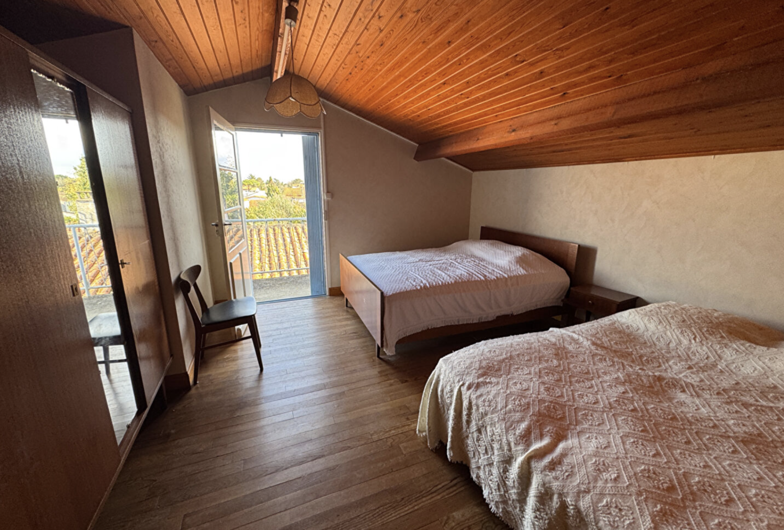 À l’étage (accès par escalier extérieur), vous trouverez deux belles chambres mansardées, une salle d’eau avec WC ainsi qu’un grenier.